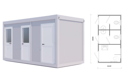 CONTENEDOR SANITARIO 1,30 x 2,05 M CON DUCHA DOBLE  – 2x cabina de ducha  – 2x lavabos con columnas de