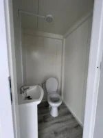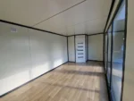 – Paredes, suelo y cubierta: Paneles sándwich PIR (100 mm) con relleno de poliuretano para un excelente aislamiento y eficiencia energética (WDK: 0,24 W/m²). Suelo de PVC con aspecto de madera y un panel de suelo OSB adicional (15 mm). Cubierta con una pendiente del 5 % para un drenaje eficaz del agua.